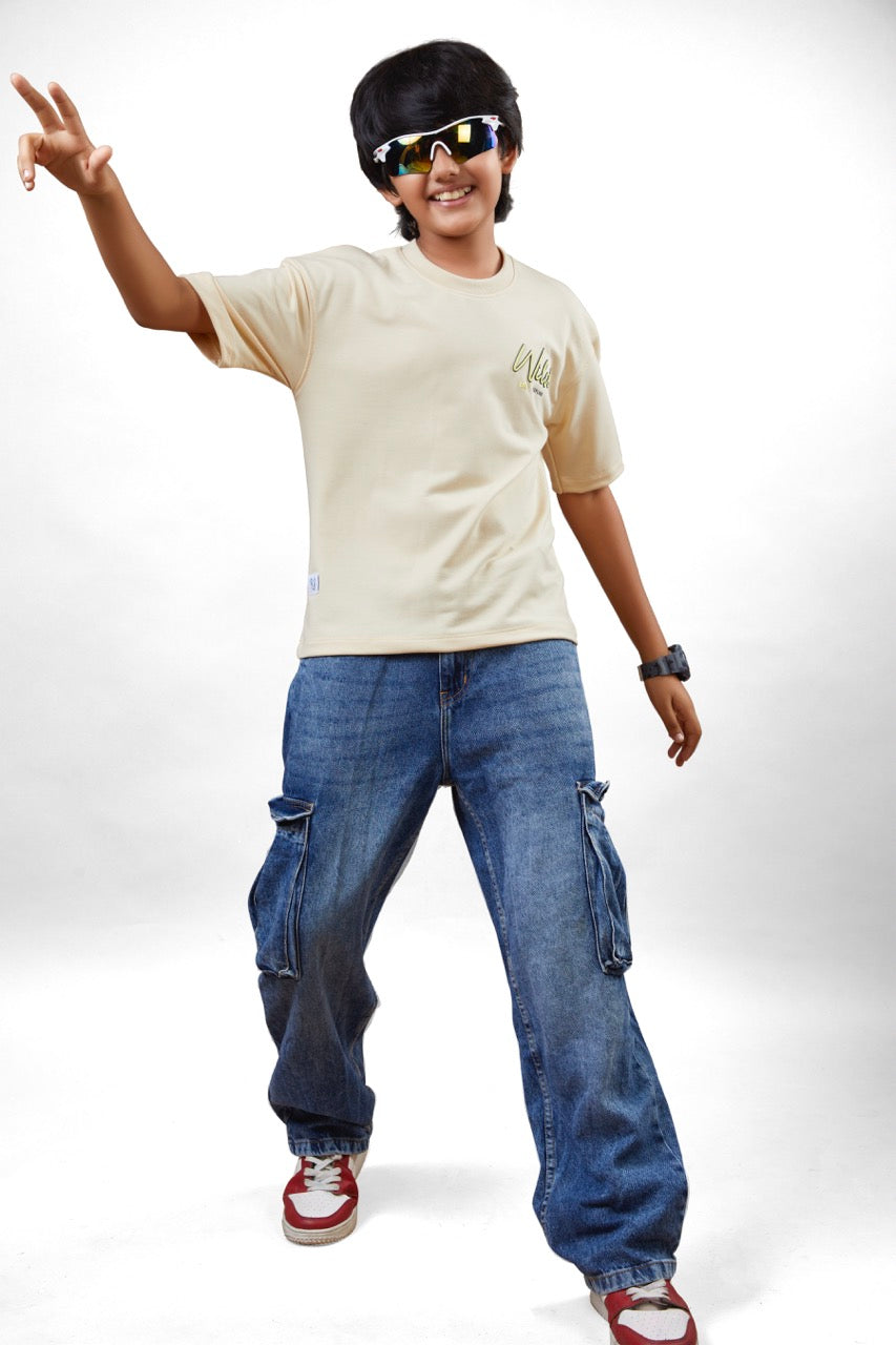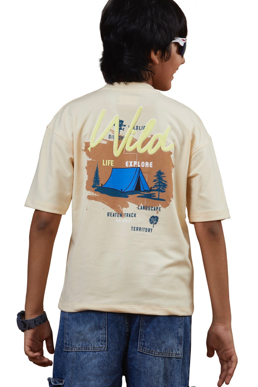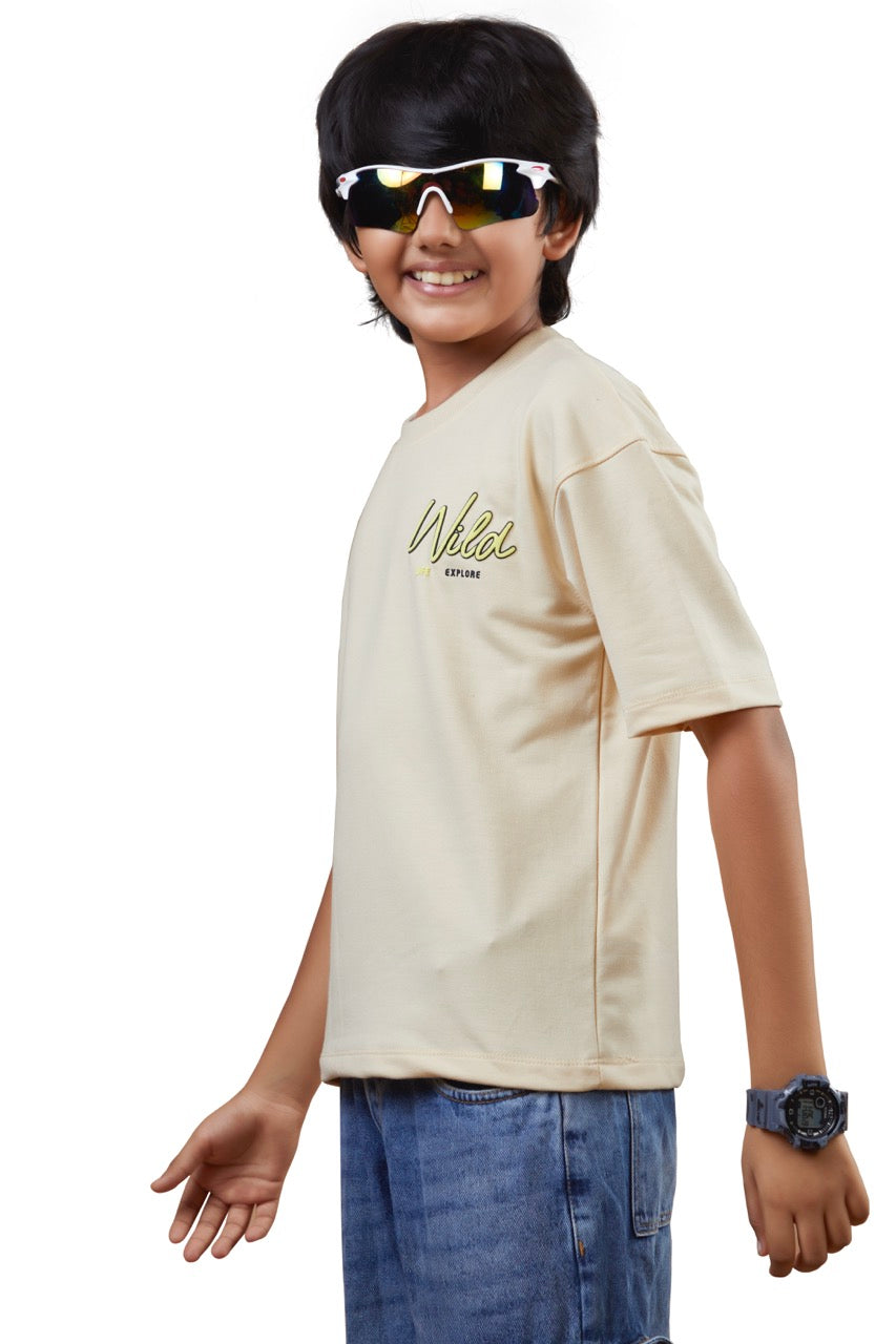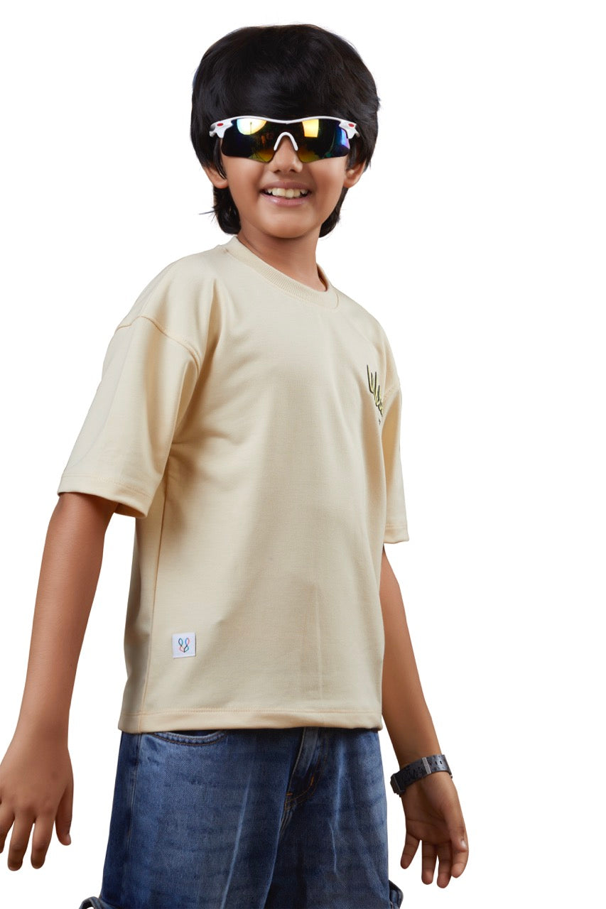 Boys Beige Half Sleeves Drop-Shoulder Tshirt