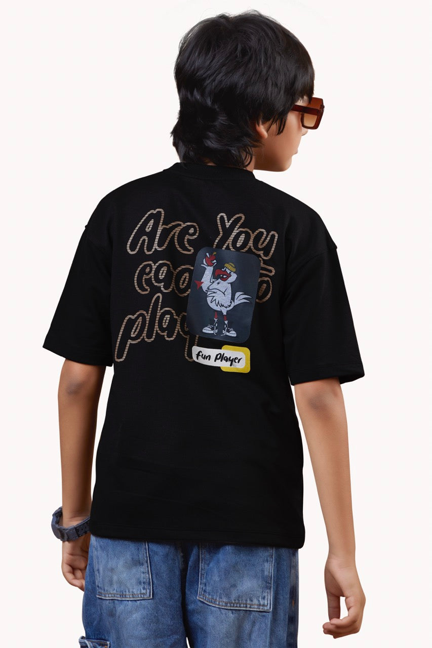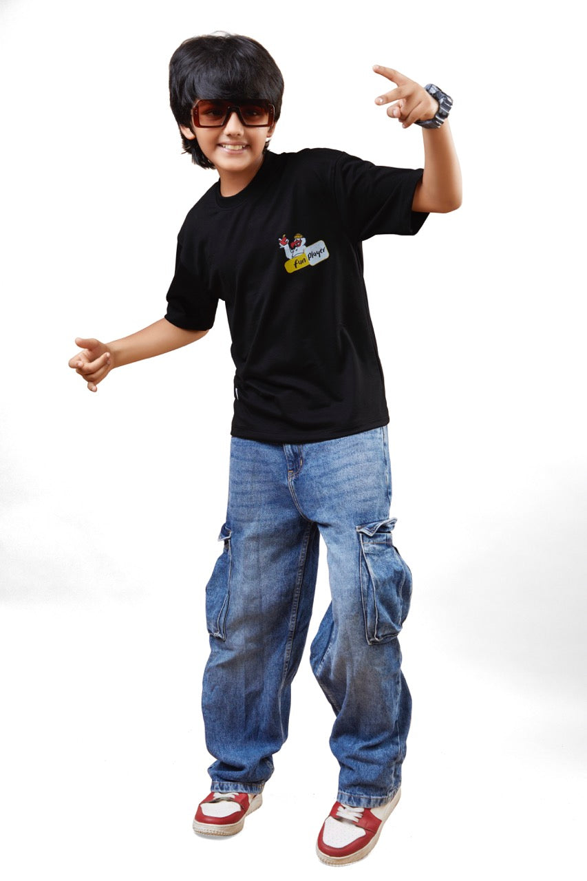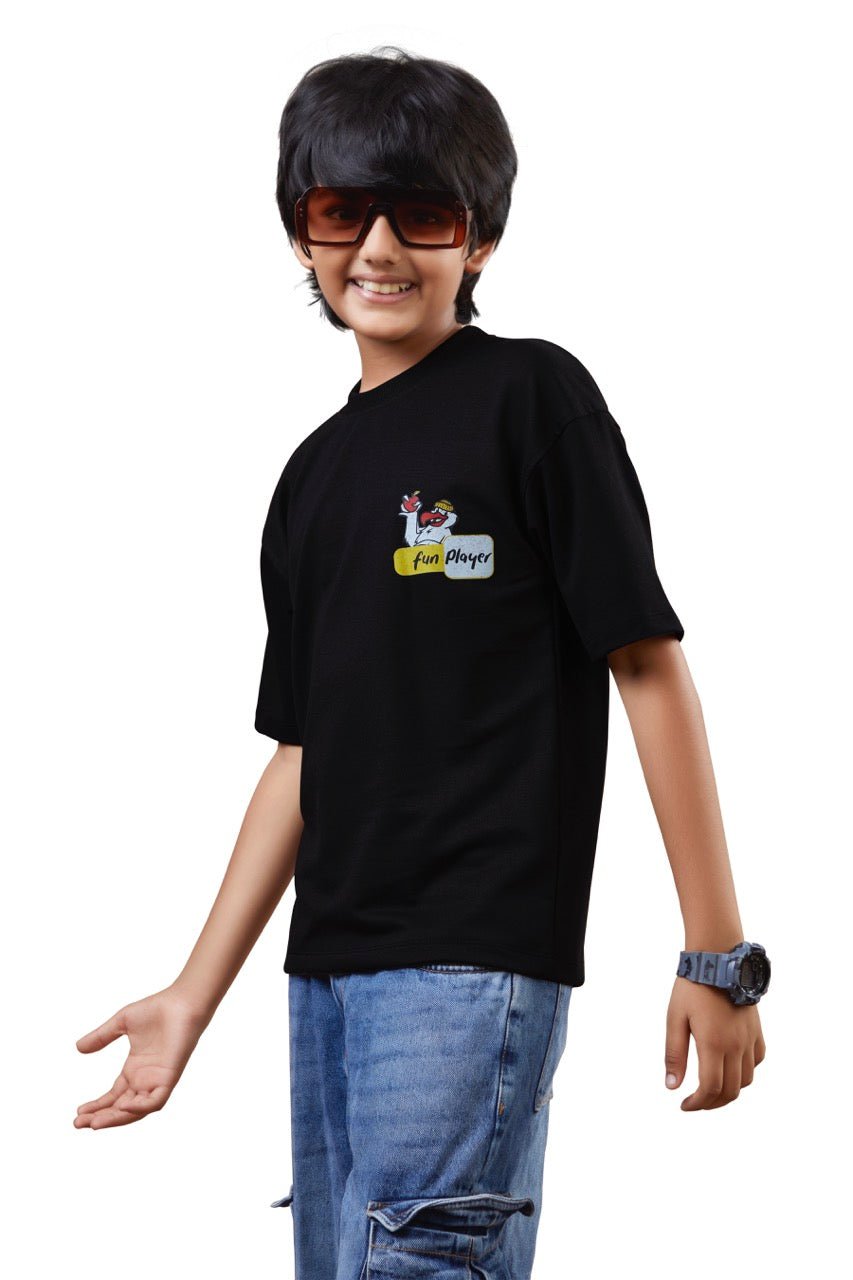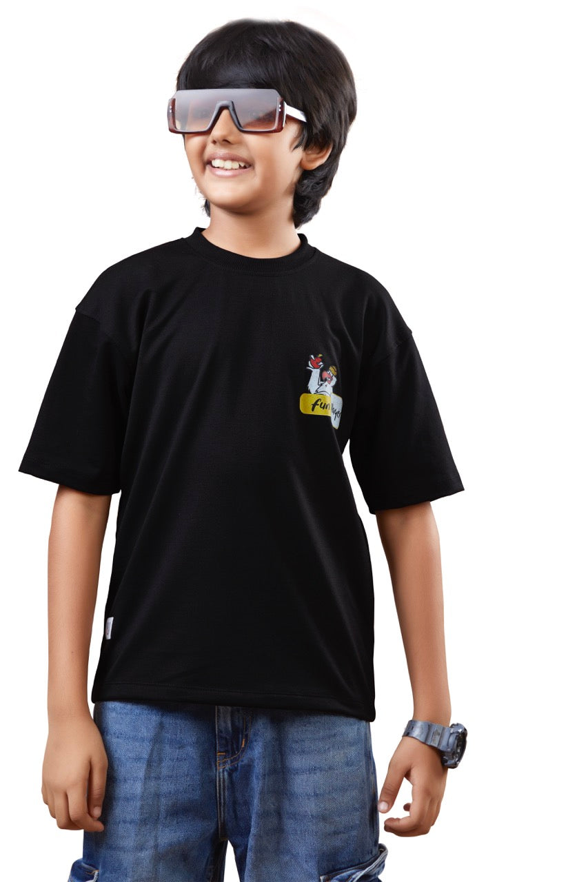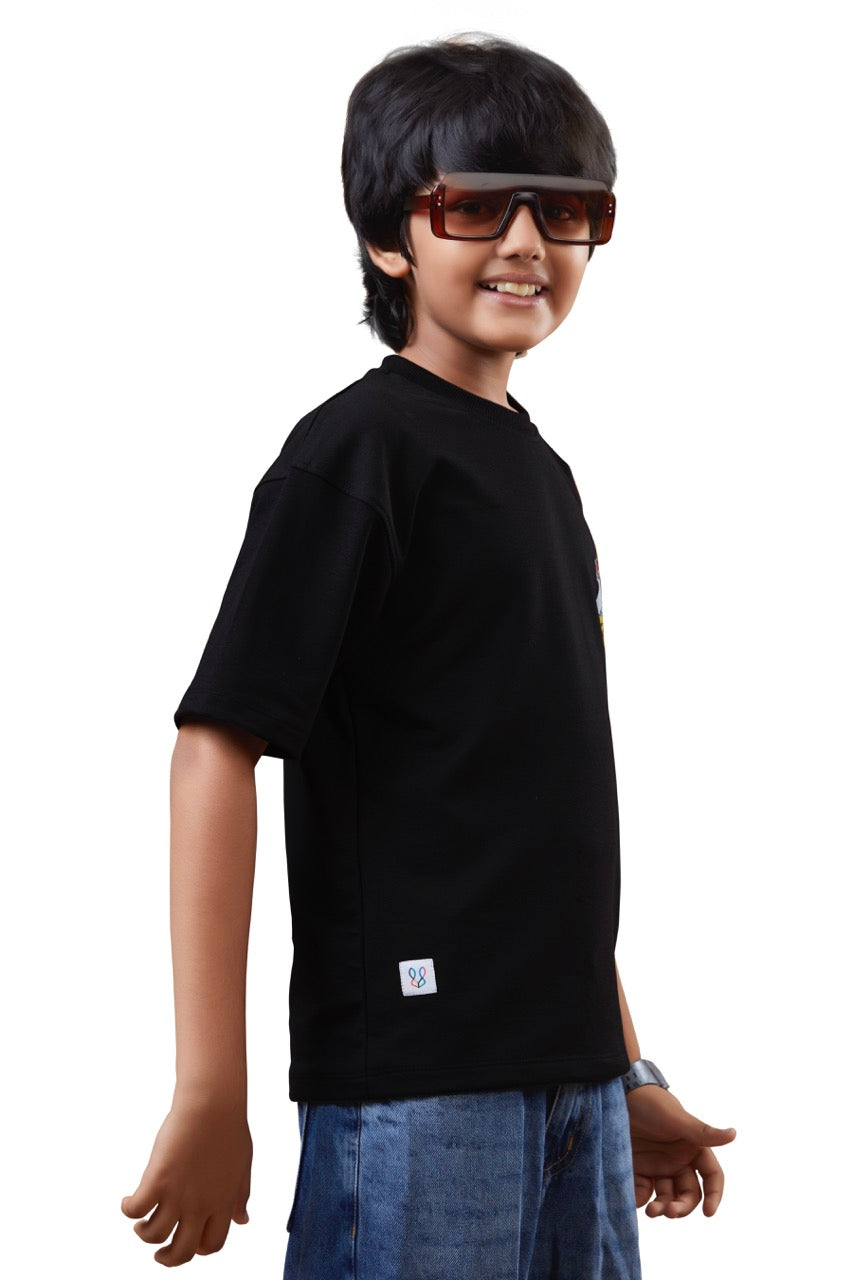 Boys Black Half Sleeves Drop-Shoulder Tshirt