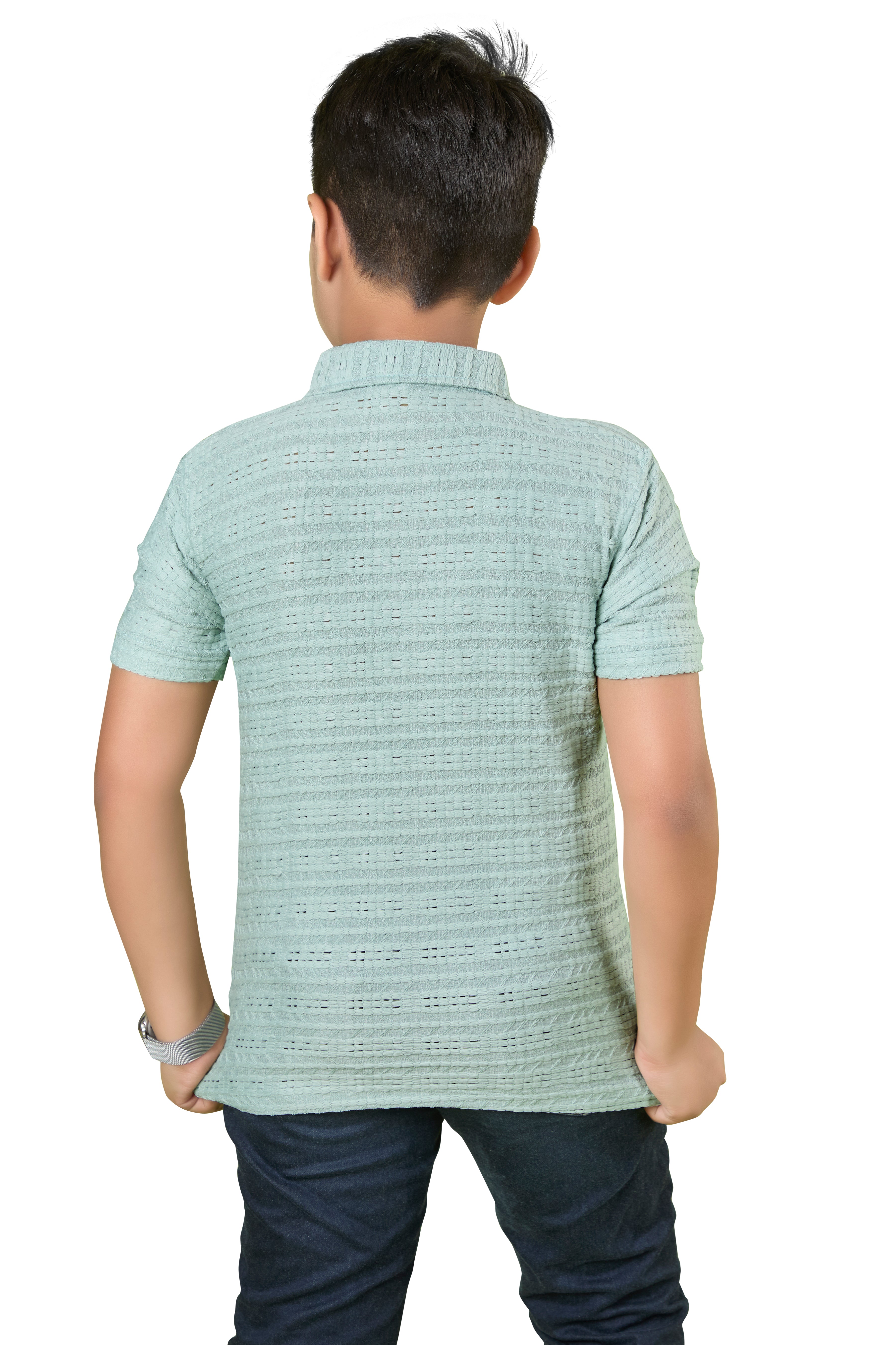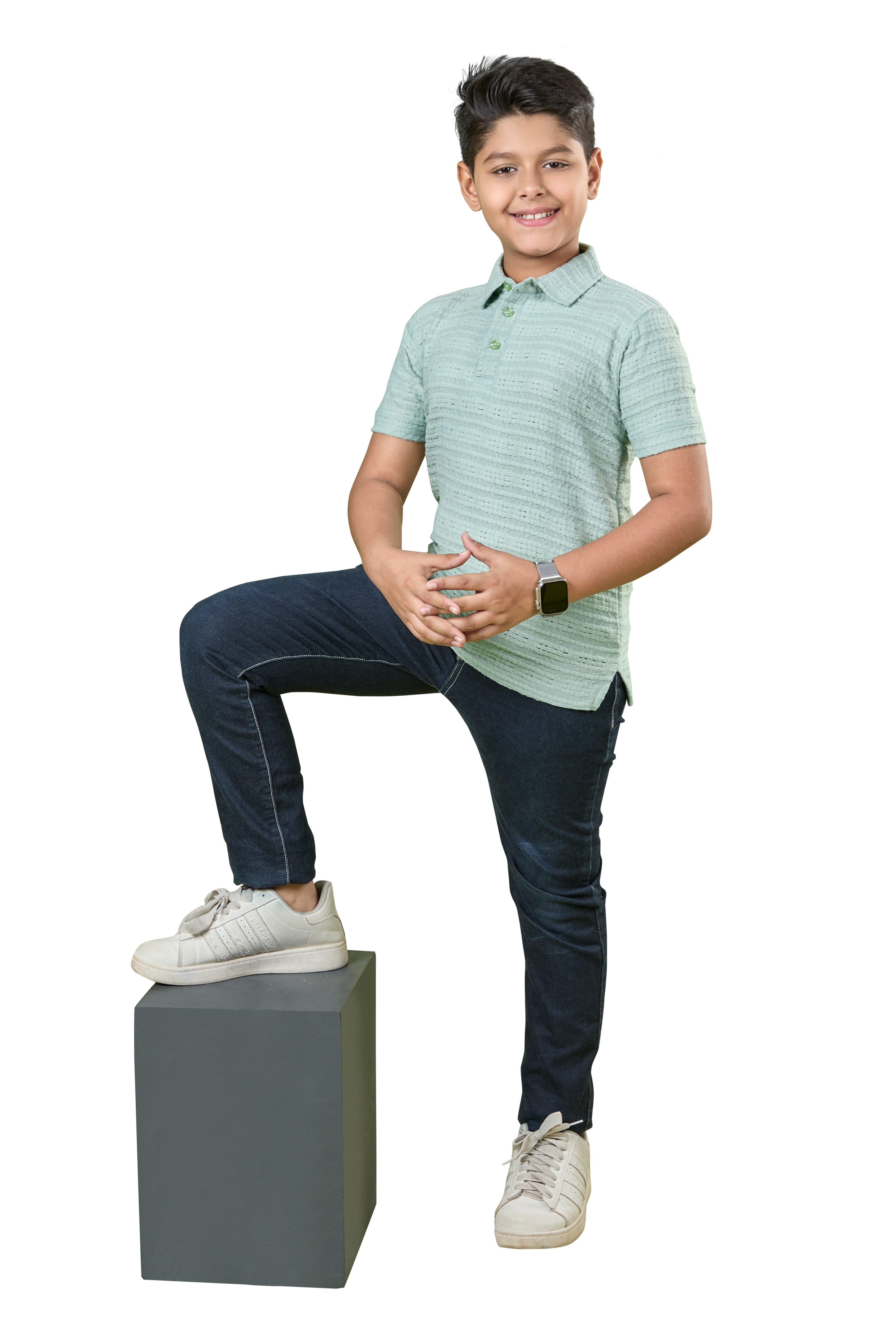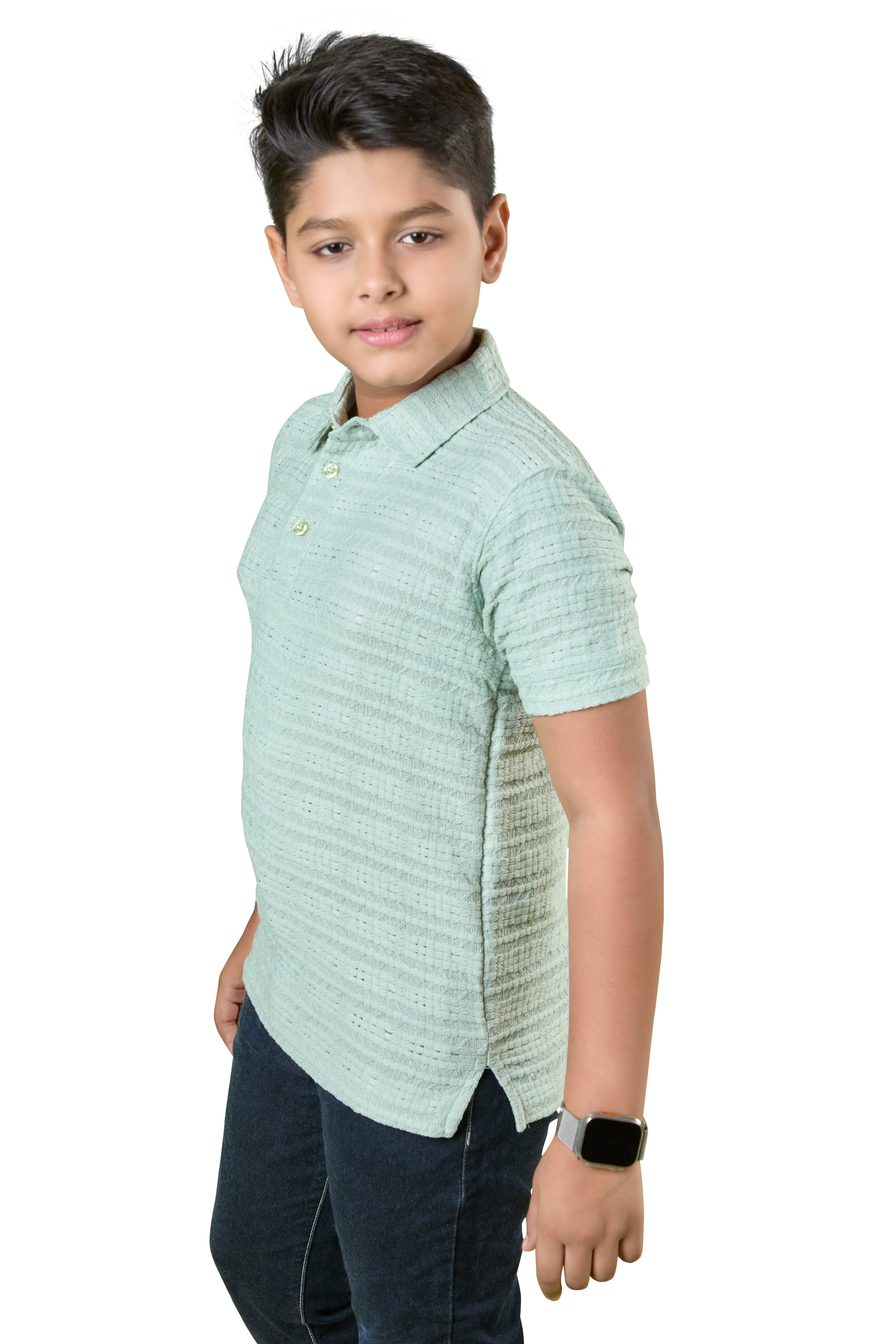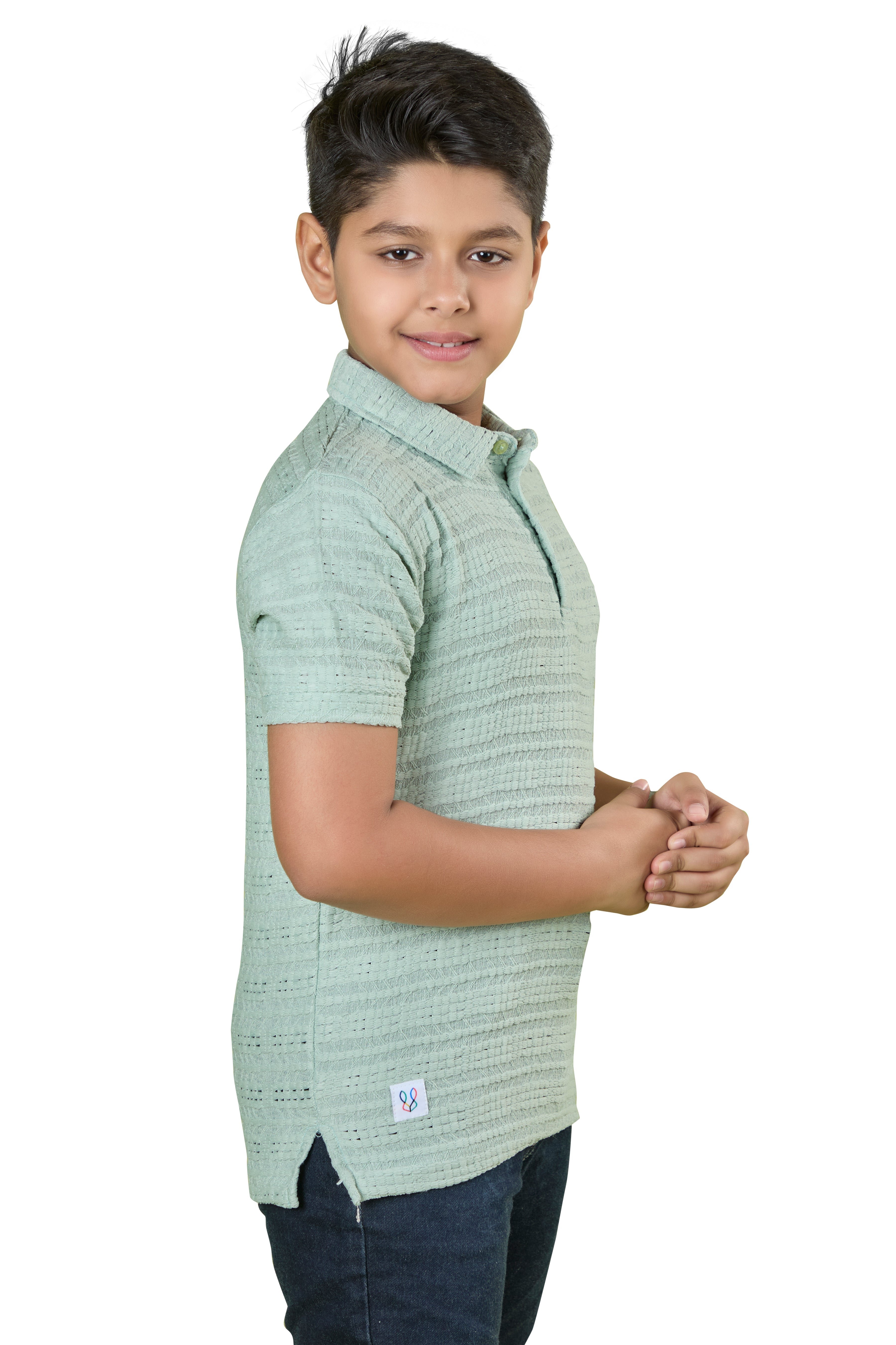 Boys Green Textured Half Sleeves Polo T-Shirt