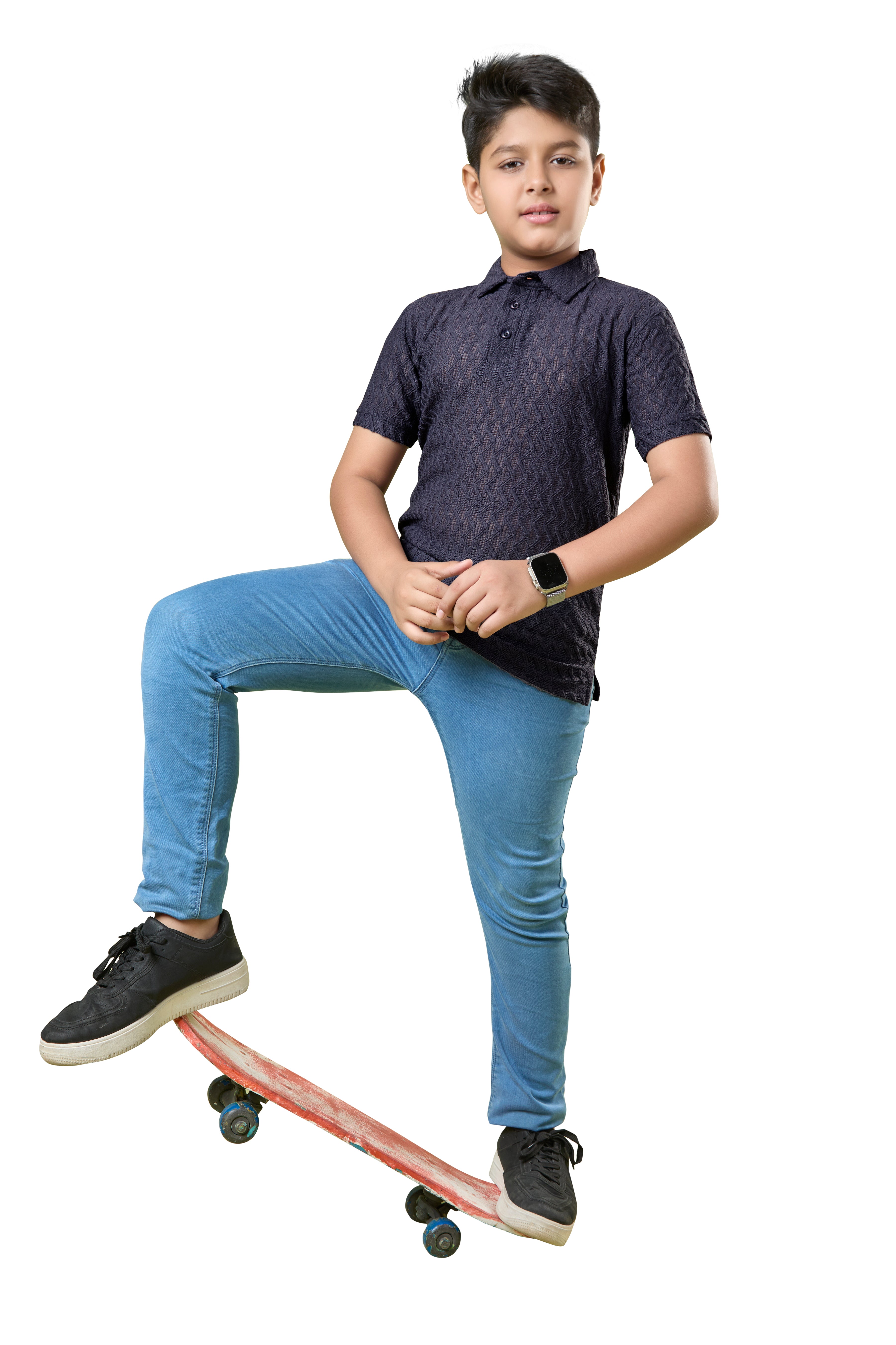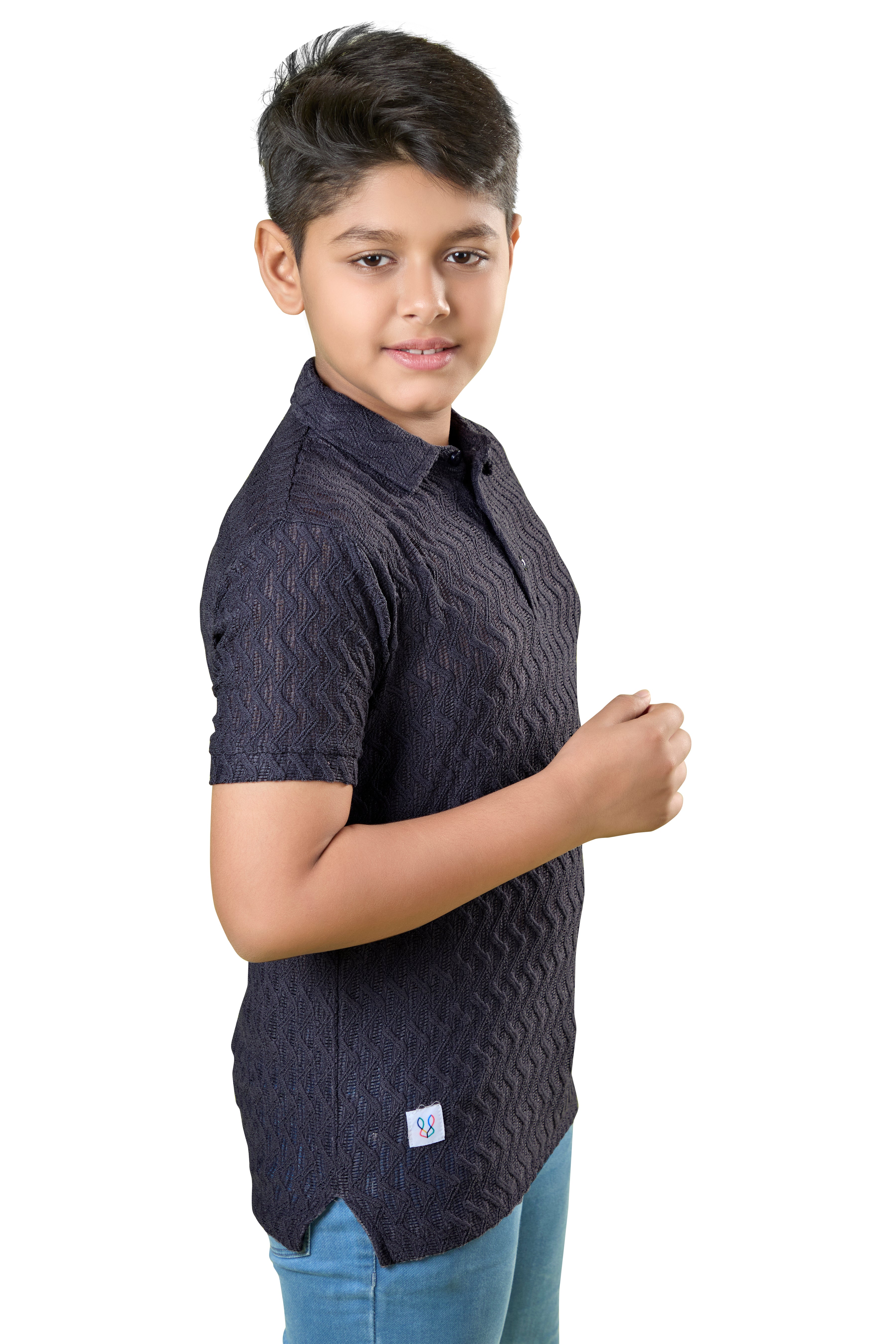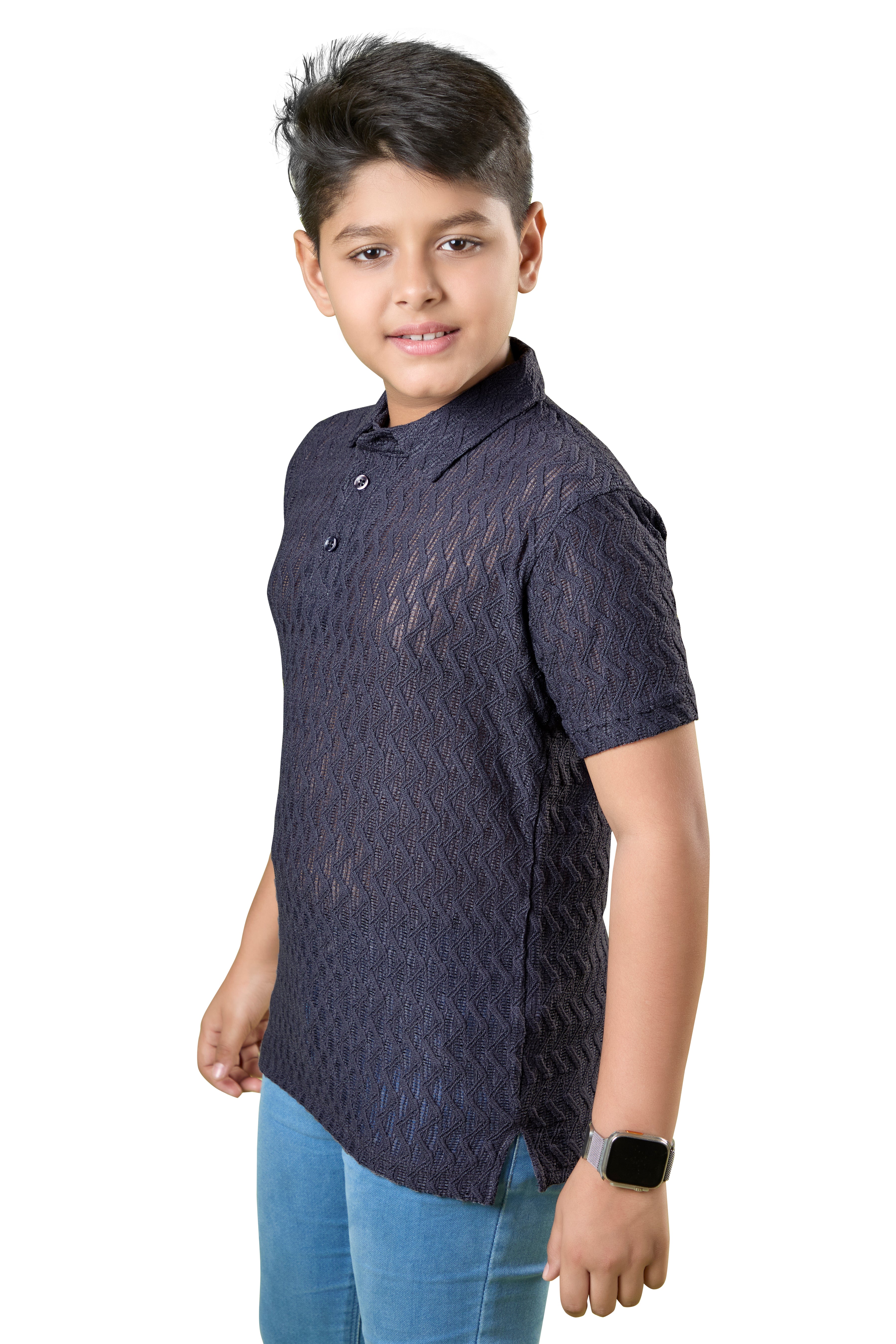 Boys Navy Blue Textured Half Sleeves Polo T-Shirt