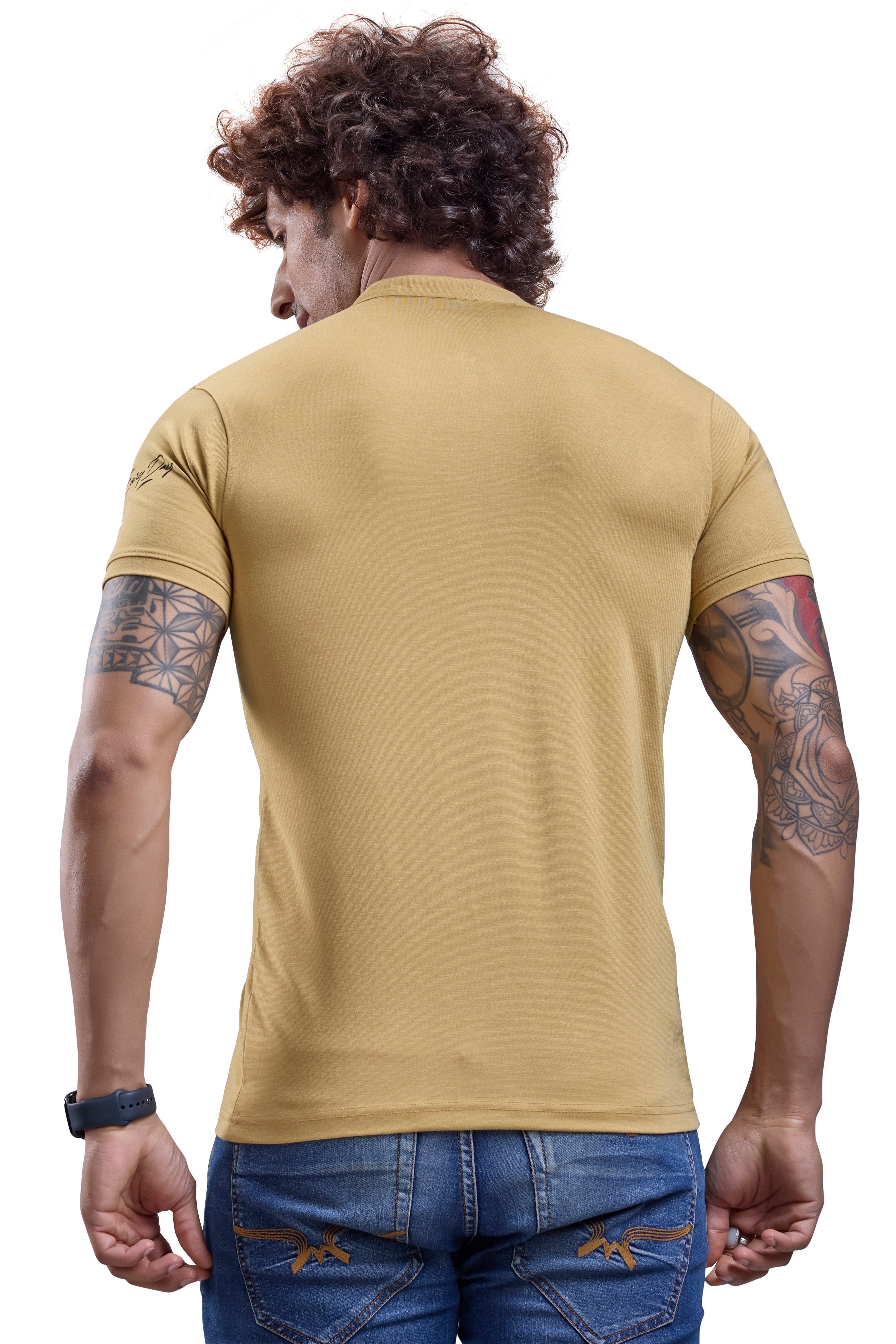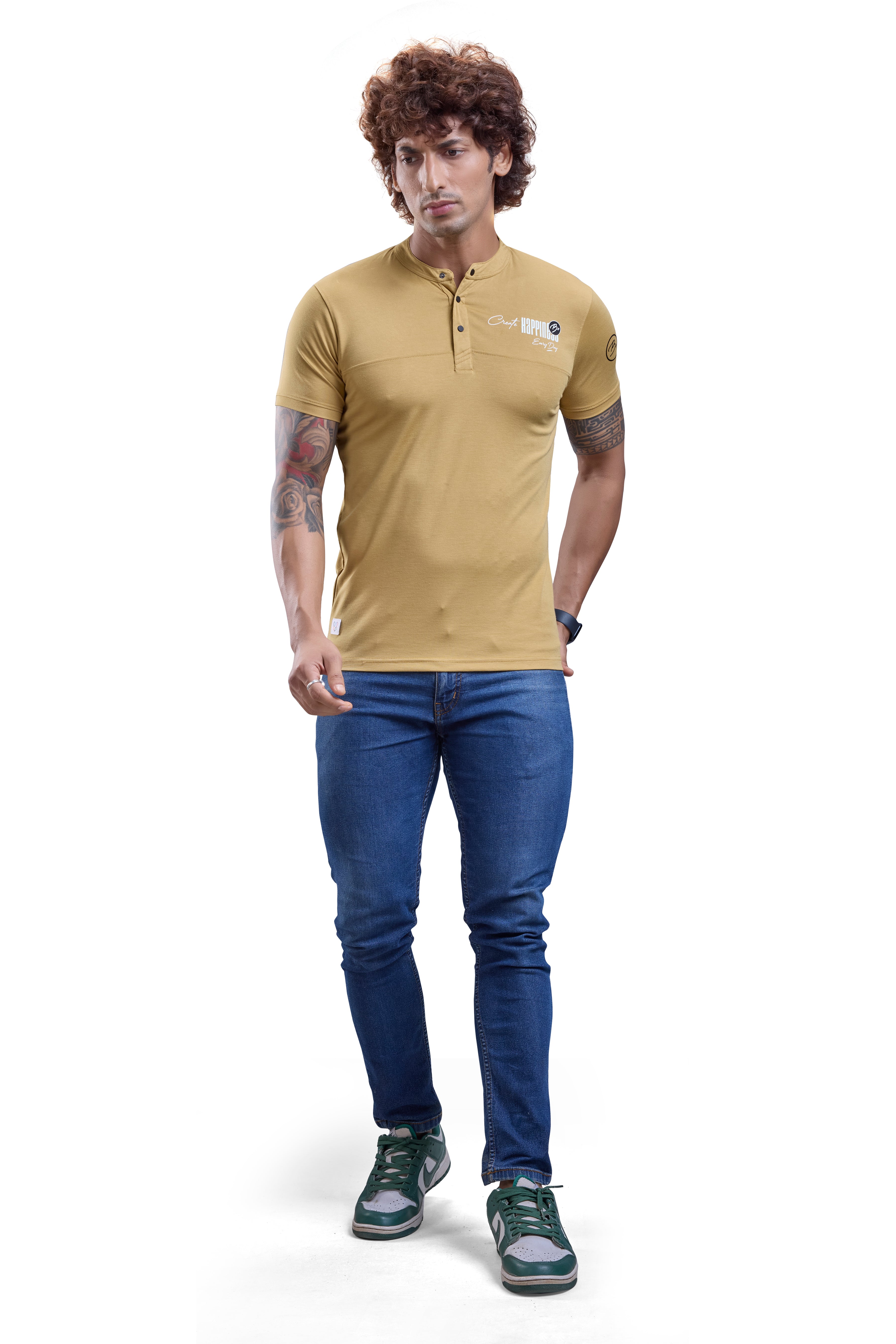 Mustard Mandarin Collar Graphic T-Shirt