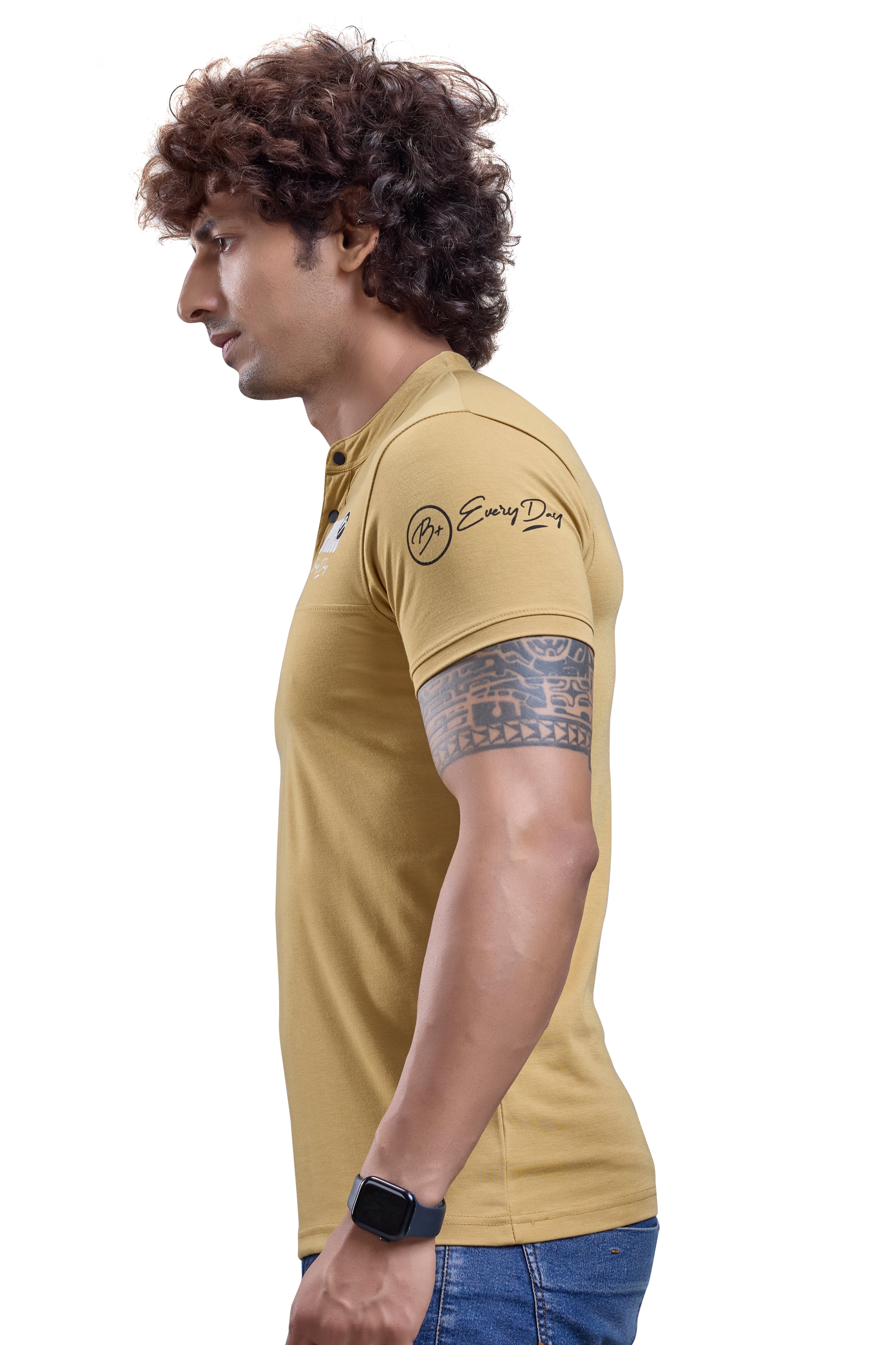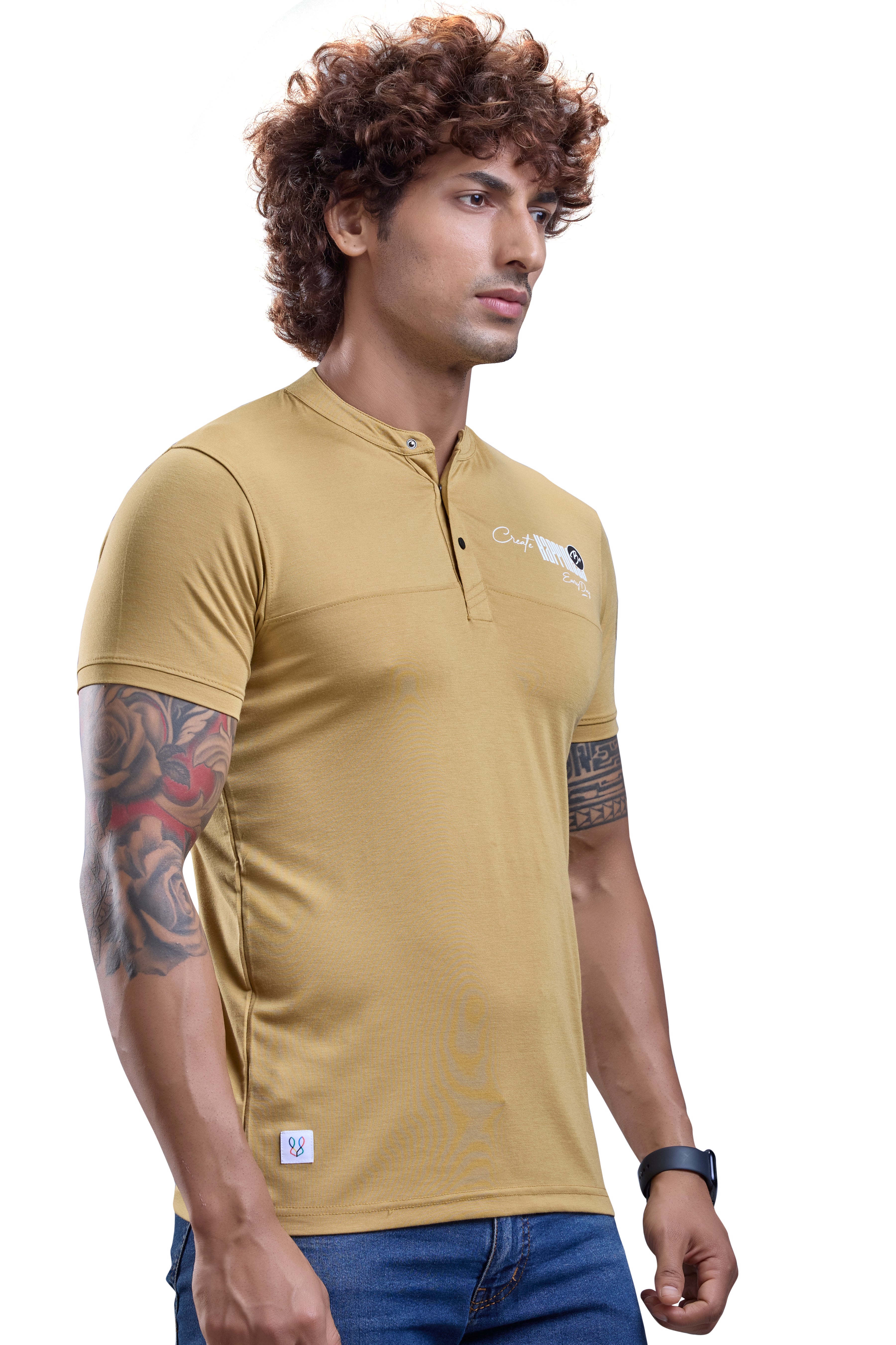 Bright and unique, this Mustard Mandarin Collar Tee with a graphic touch adds confident style to any wardrobe.