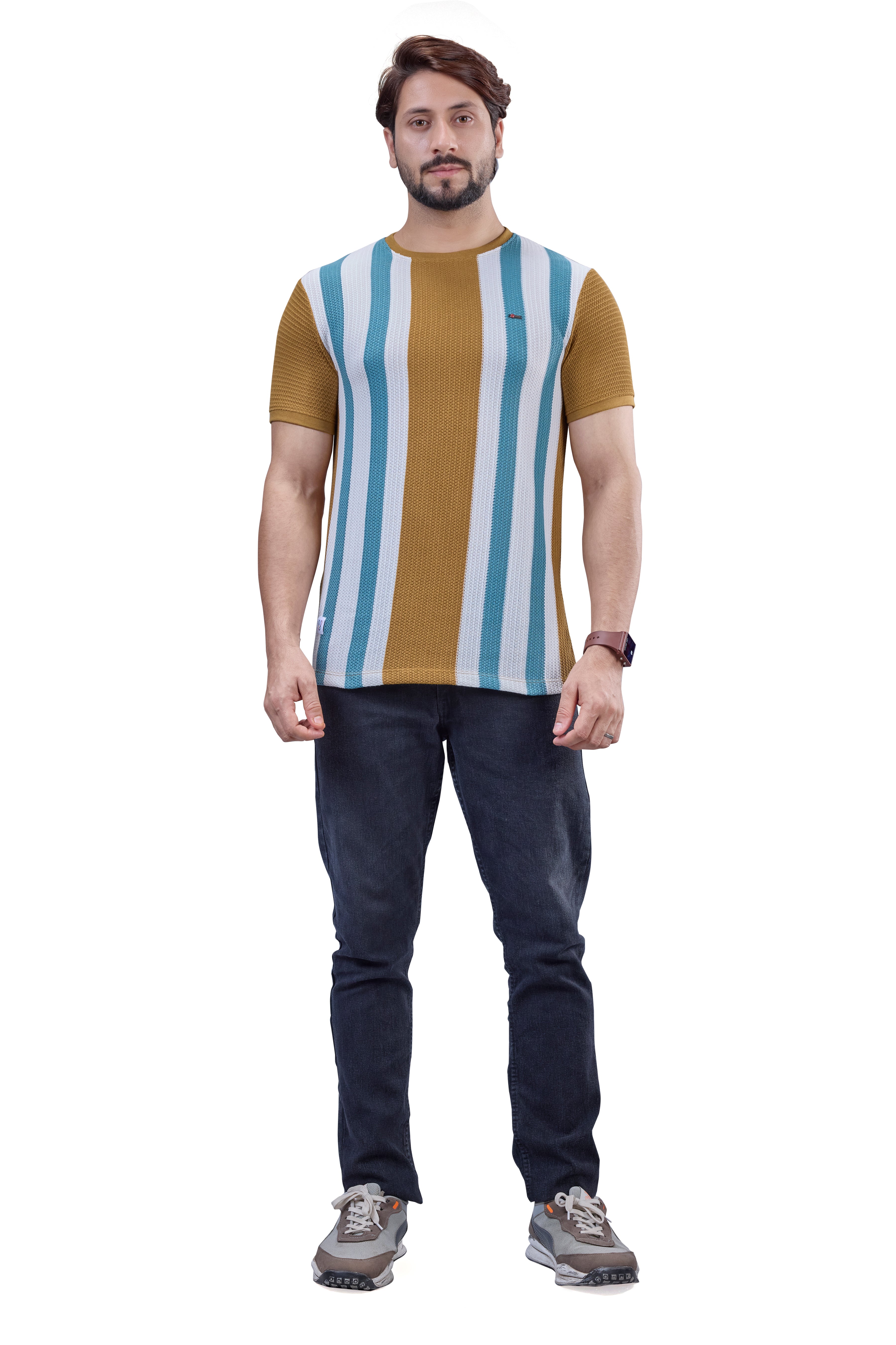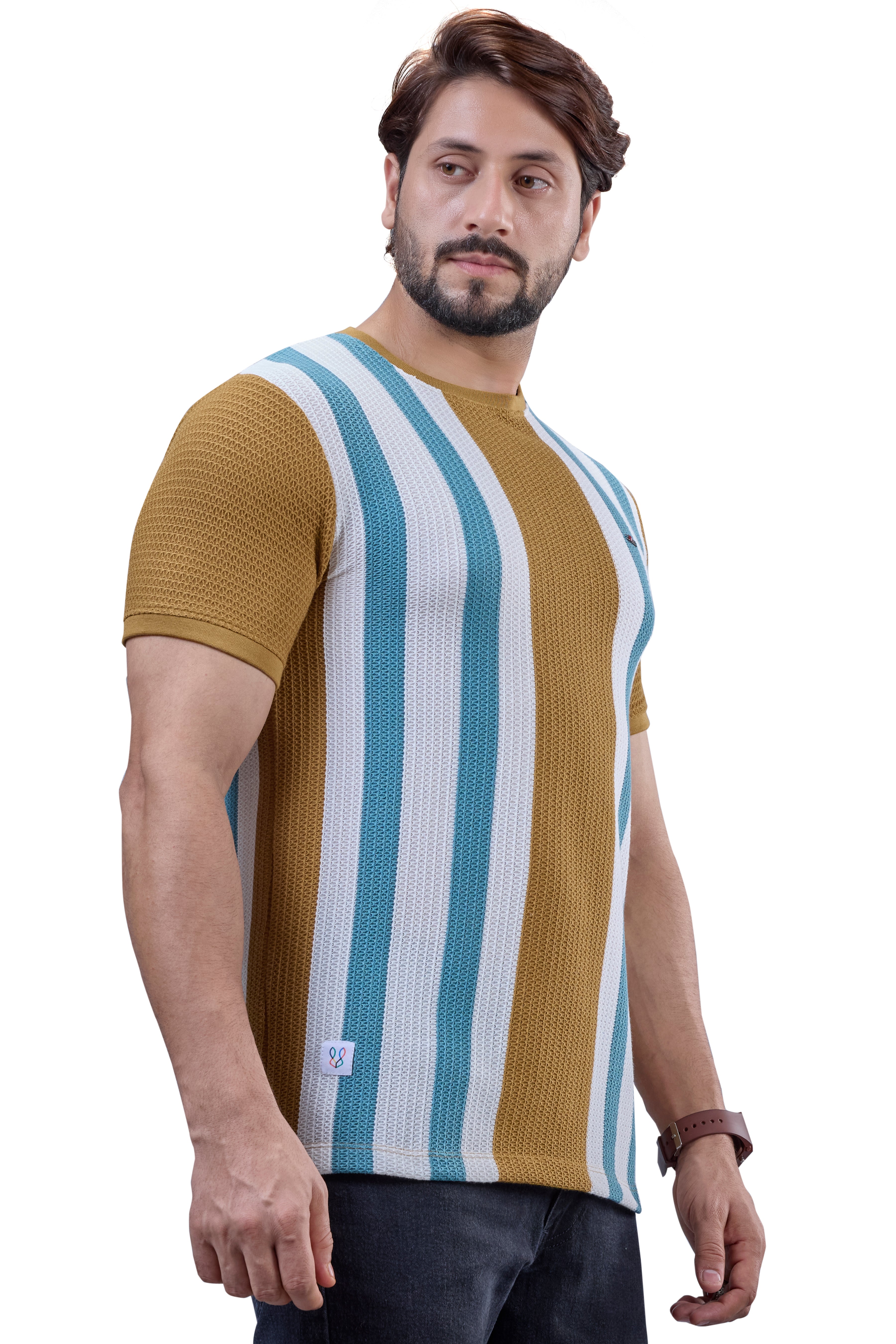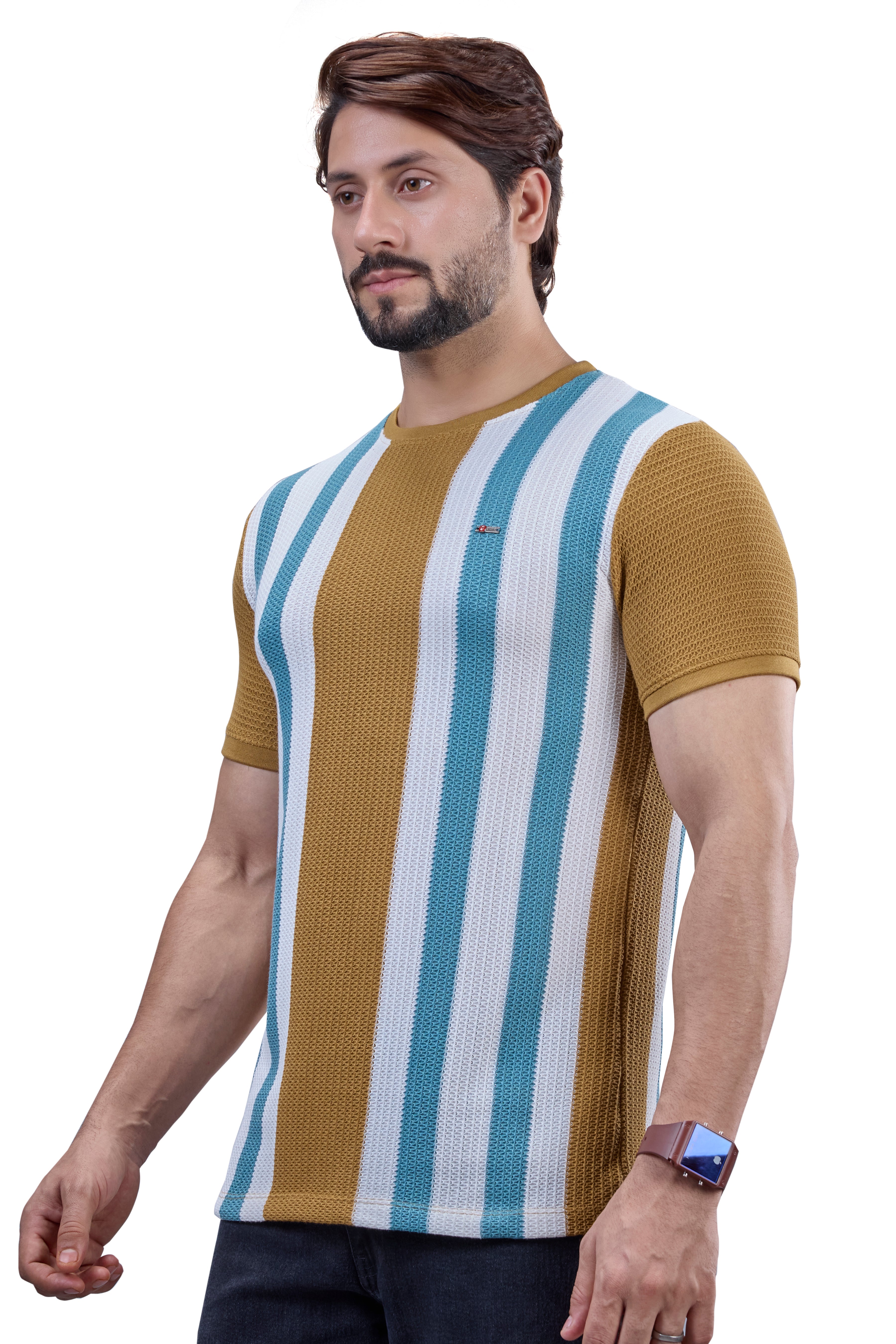 Mustard & Teal Striped Textured Crew T-Shirt