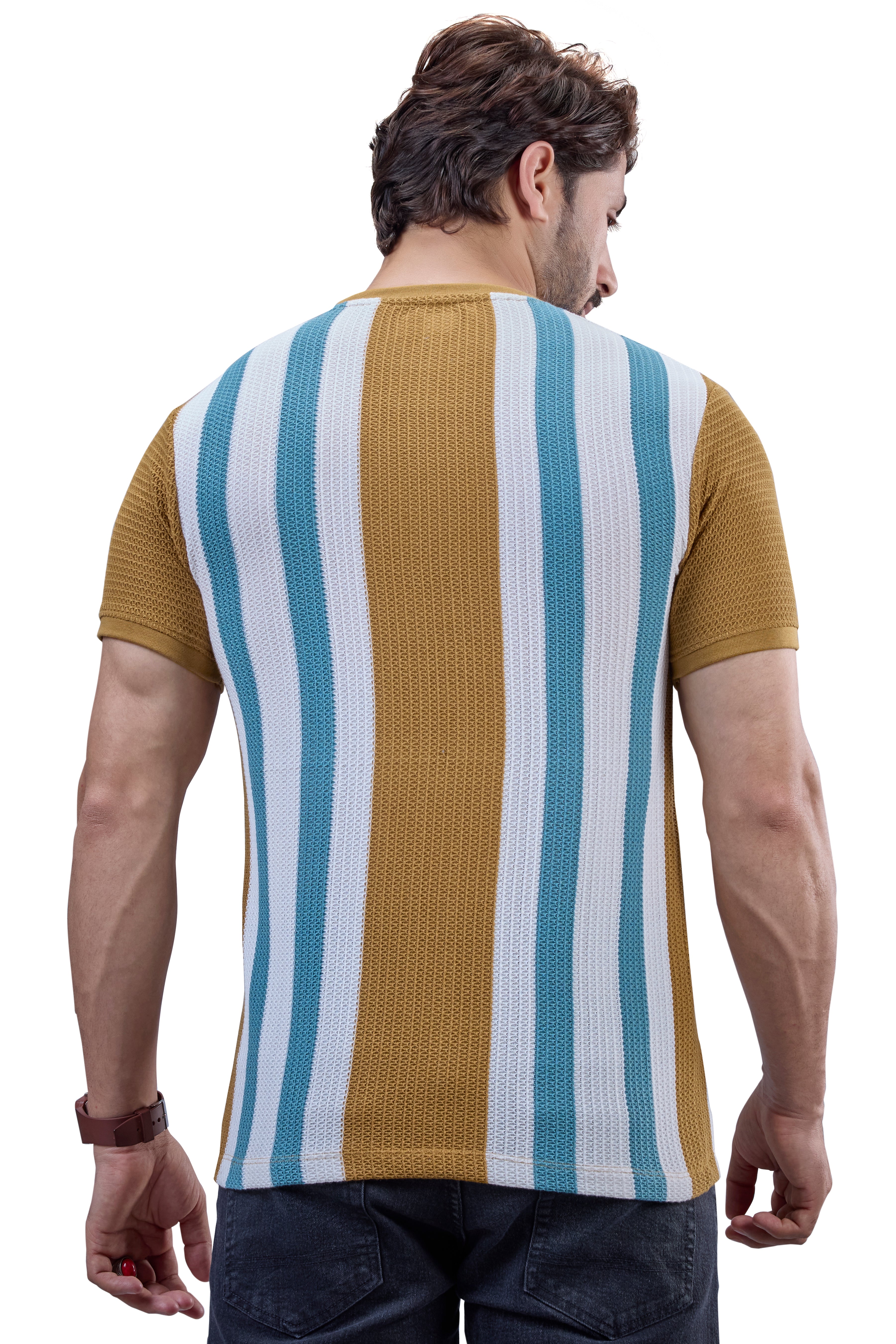 Unique and vibrant, the Mustard & Teal Striped Textured Crew Tee brings color and comfort to casual wear.