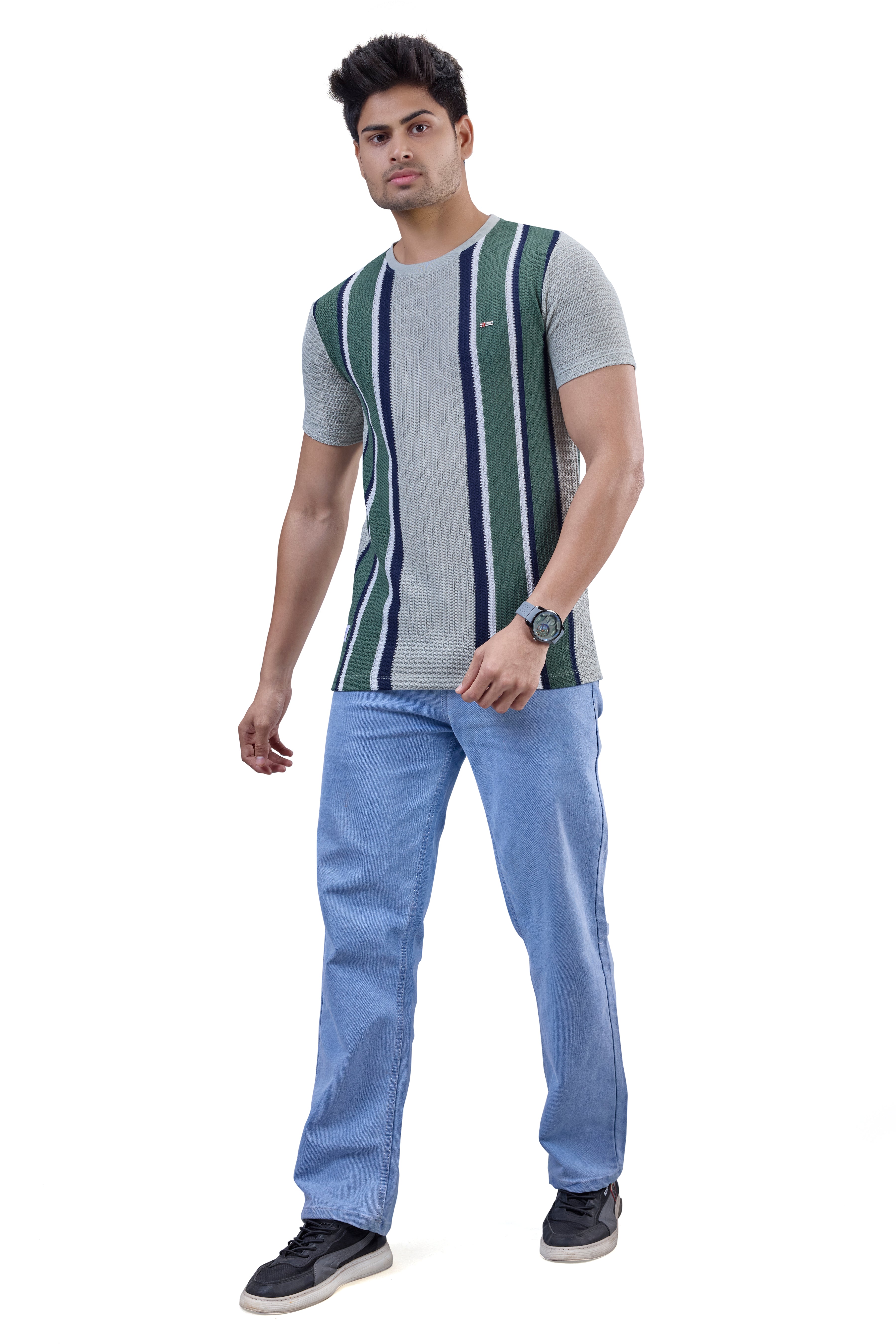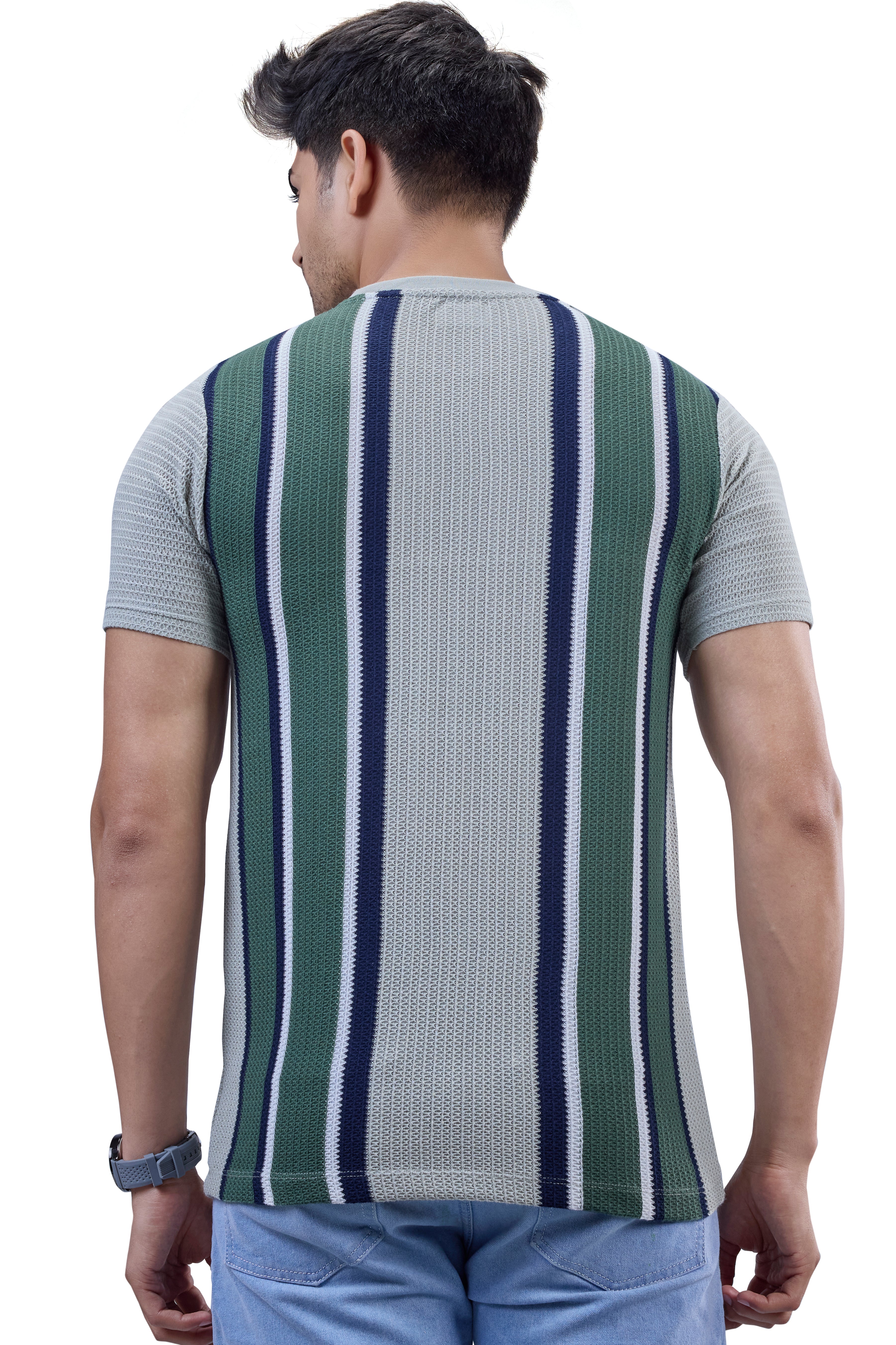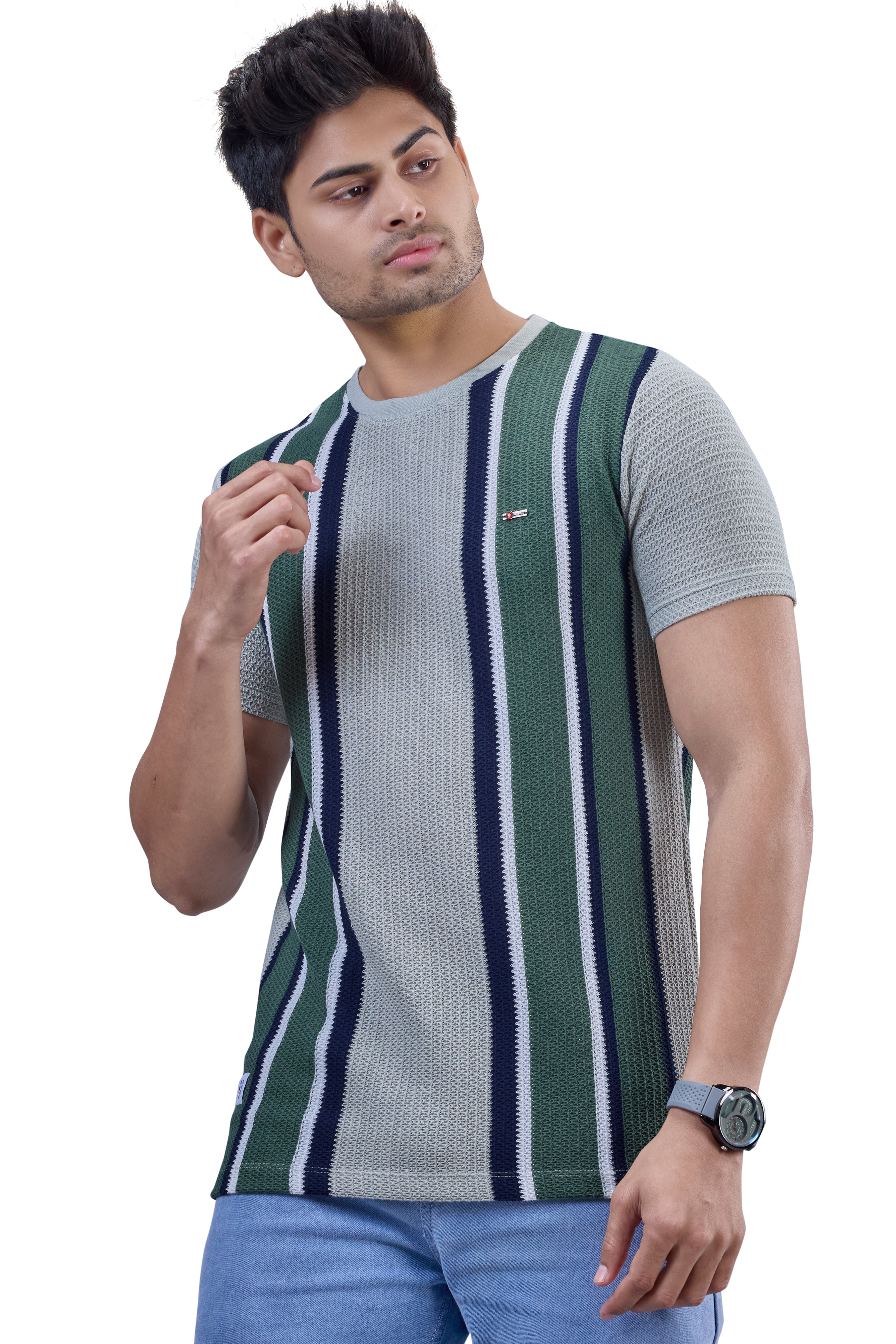 Fresh and versatile, the Green & Navy Striped Textured Crew Tee blends casual comfort with timeless stripes.