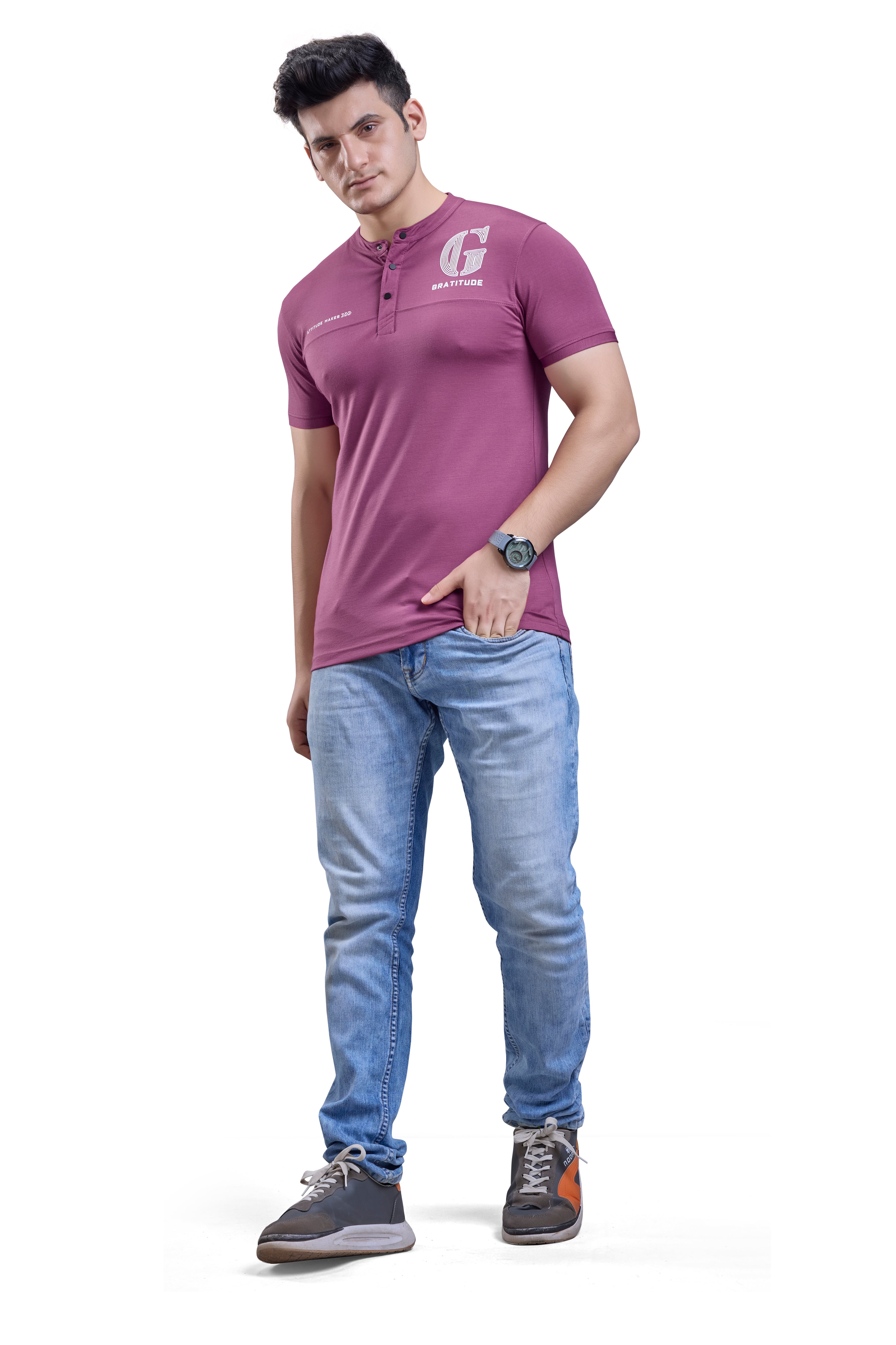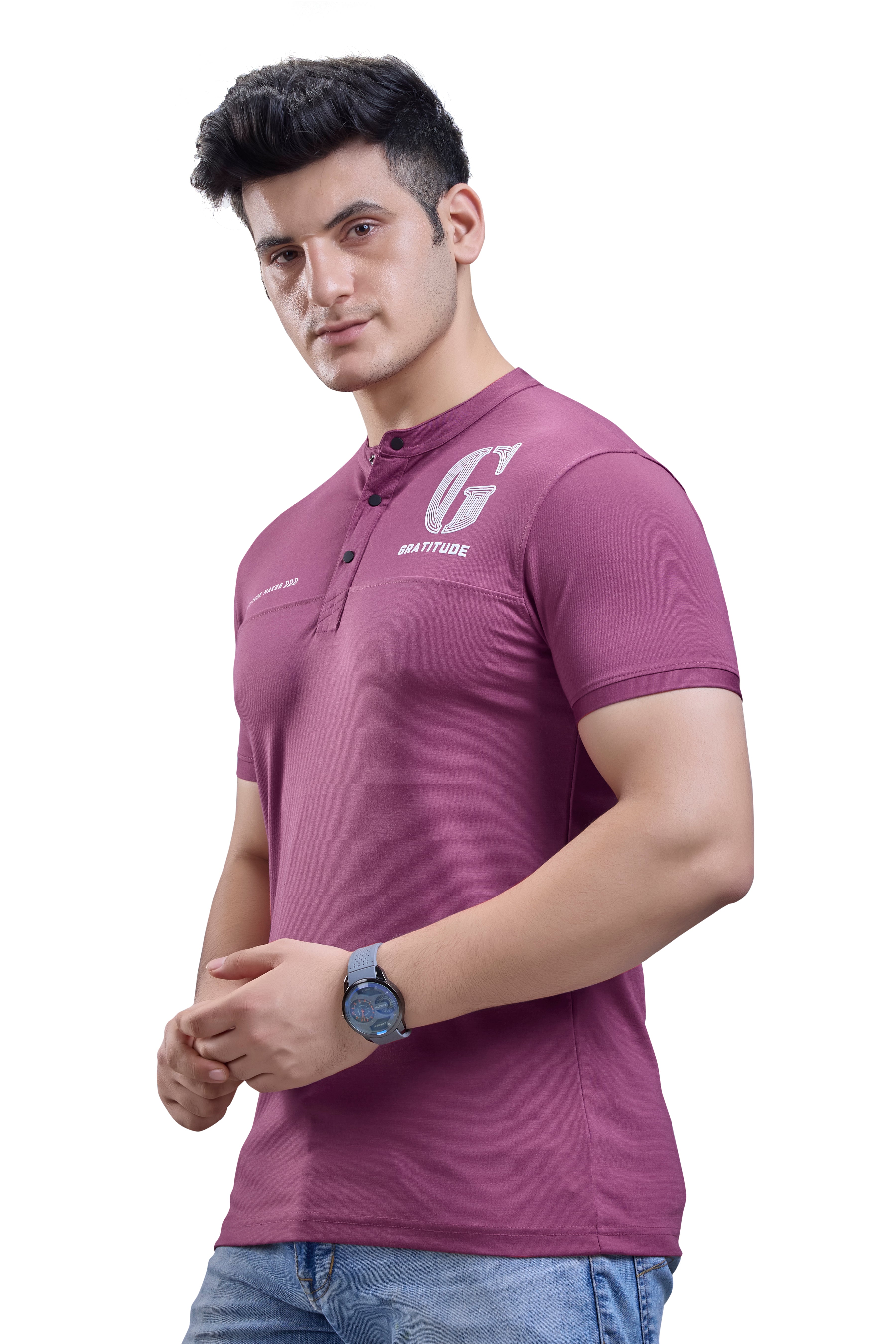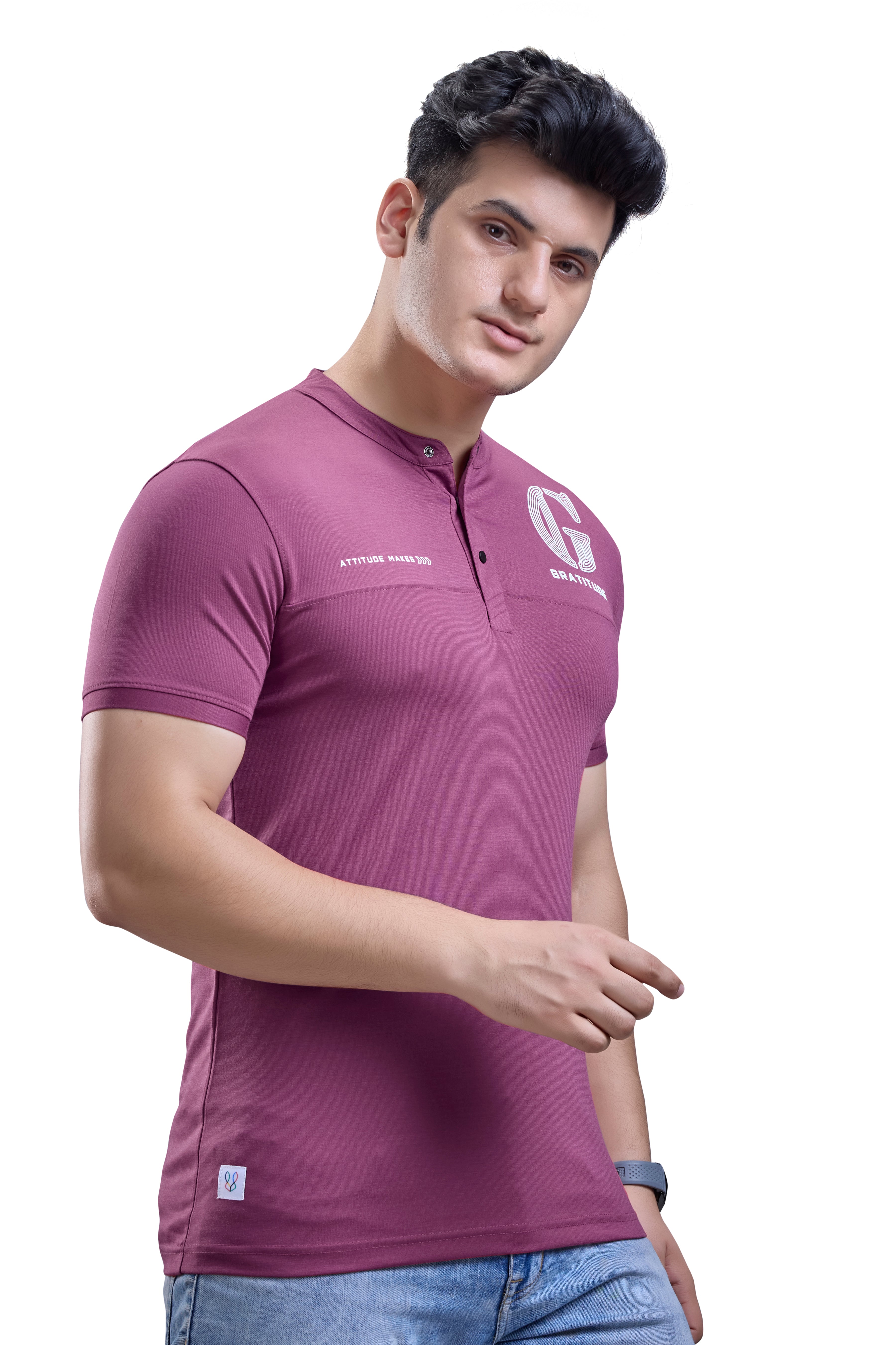 Bold yet elegant, this Magenta Rose Mandarin Collar Tee with a graphic print makes casual dressing effortlessly stylish.